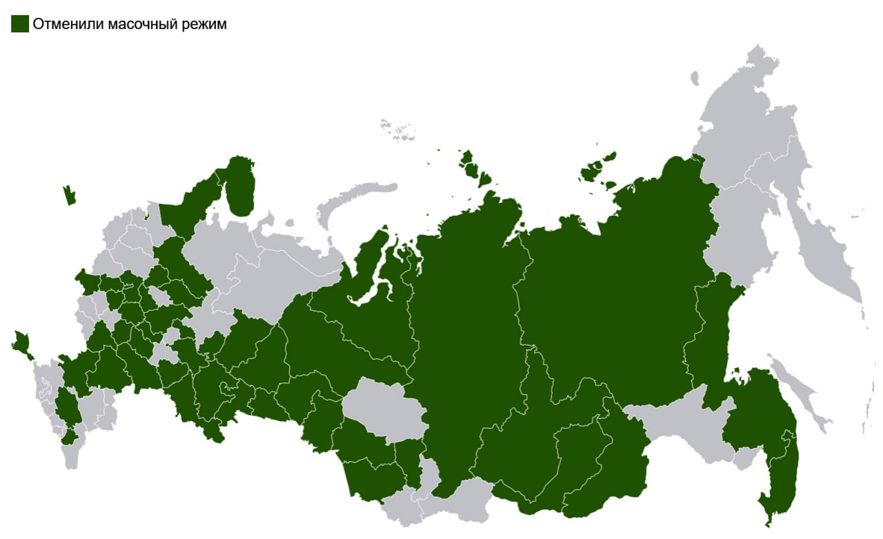 Заболеваемость коронавирусом в России неизменно падает уже четвертый месяц подряд. Из-за этого уже несколько десятков регионов за последнее время официально отказались от масочного режима. Где-то послабление обозначено как временное, где-то введено с некоторыми оговорками — по местам ношения или по характеру мероприятий.