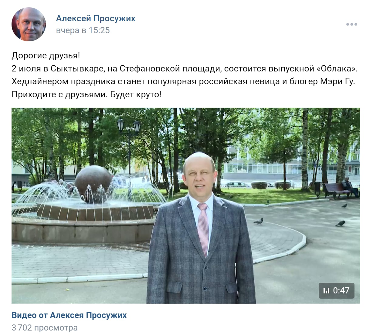 Заместитель Председателя правительства Коми Алексей Просужих пригласил выпускников на фестиваль «Облака». Он разместил видео у себя на странице, хотя мог обратиться к администраторам telegram-каналов и увеличить охват целевой аудитории. Его подписчики в ВК это в основном люди его возраста или чуть-чуть помладше, то есть давно не выпускники, на кого рассчитывал этот добряк непонятно.