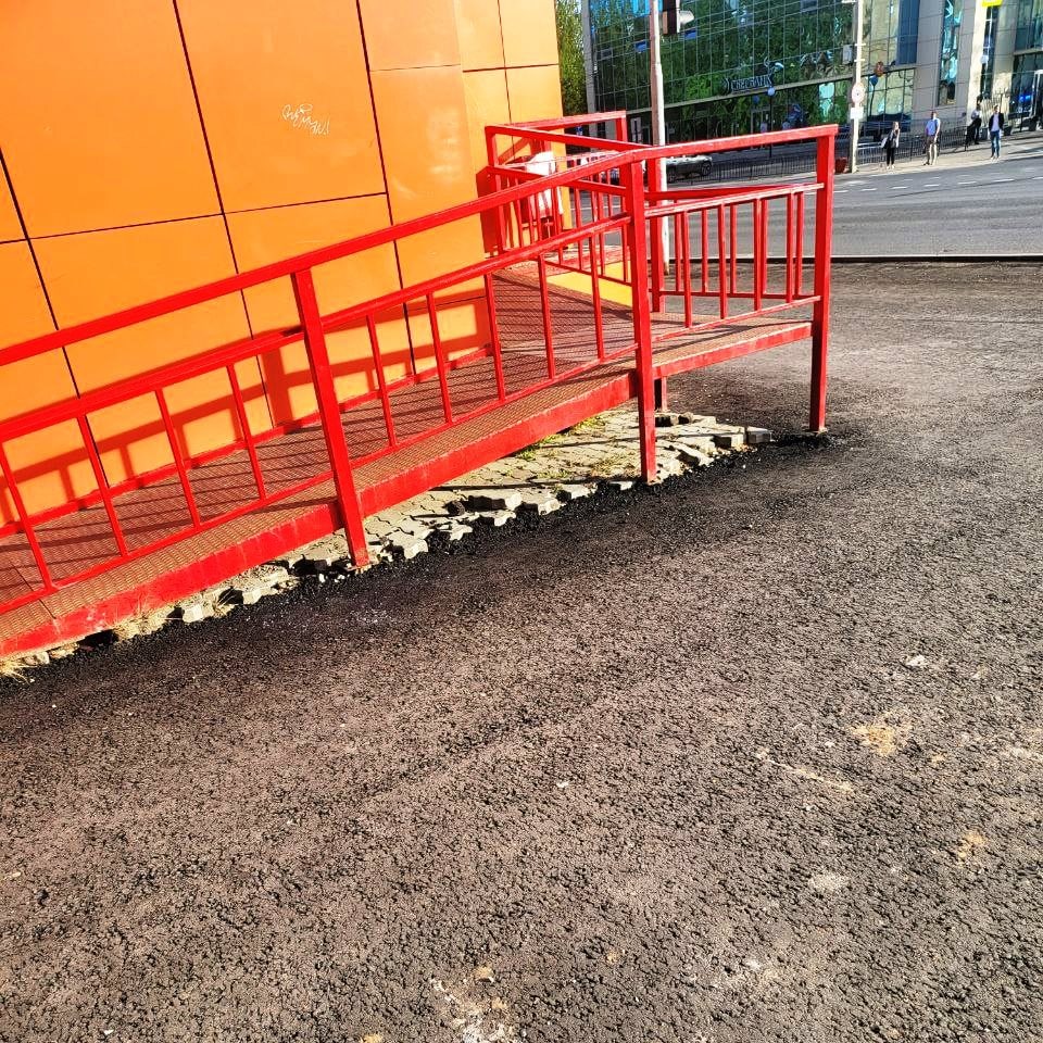 Рабочие разобрали где смогли старый тротуар от брусчатки и заменили его не асфальт, но остались места, куда они не смогли добраться. Или просто не стали лезть под пандус. Достать всю брусчатку было бы возможно, но вот заменить под пандусом будет нереально, вот и оставили так. Ярые урбанисты раскритиковали бы такой поступок, но не забывайте где мы живём.