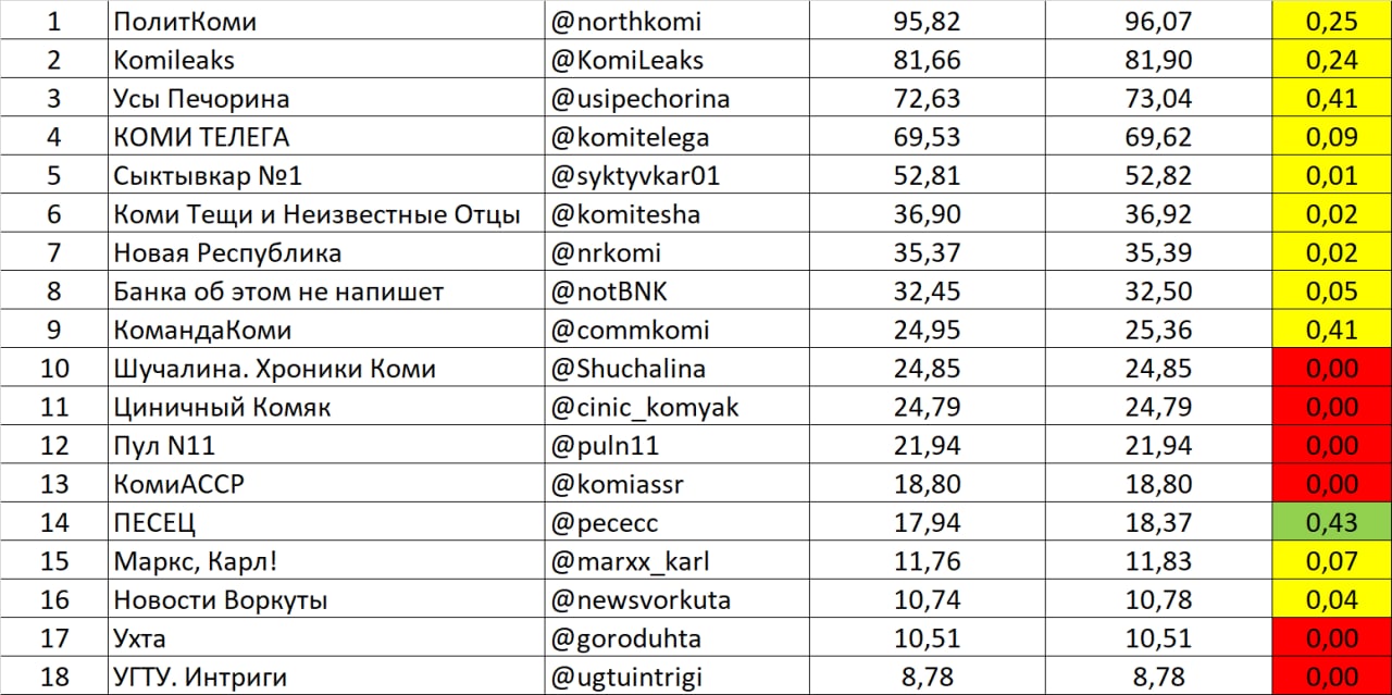 Выходной день на календаре, а это значит, что пора знакомить читателей с рейтингом цитирования каналов местной коми поляны. По многочисленным просьбам мы убрали каналы, которые давно не пишут и почти умерли.