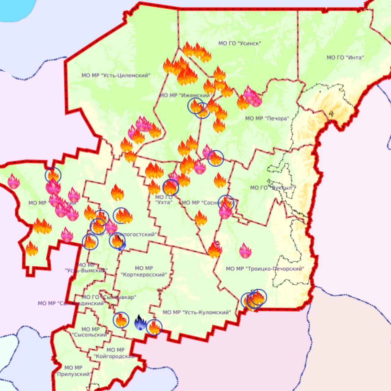 В связи с установившейся устойчивой сухой и жаркой погодой, ростом количества и площади пожаров в лесах Княжпогостского района, вечером 13 июля на территории Княжпогостского района введен режим "Чрезвычайная ситуация".