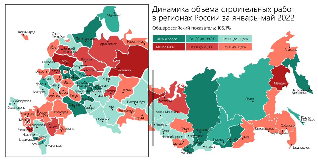В кризисный период, когда одни секторы экономики теряют в показателях, а другие демонстрируют нестабильность, продолжает неплохо себя чувствовать сфера строительства. "Росстат" опубликовал данные о динамике строительных работ в регионах РФ за январь-май 2022 года. В среднем по России показатель составил 105,1%.