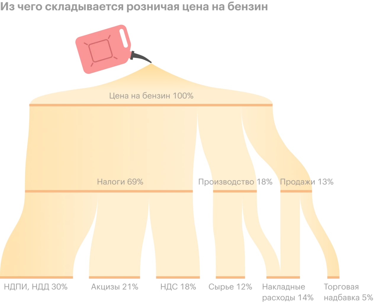 Примерно треть стоимости литра бензина в России — это налоги на добычу полезных ископаемых и на дополнительный доход. Еще 21% приходится на акцизы, 18% — на НДС. Остальное — стоимость нефти, переработка, логистика и тому подобное. Чистая прибыль продавца — всего 5%. Для сравнения, наценки в ретейле даже на социально значимые товары, например хлеб или молоко, составляют в среднем 13%.
