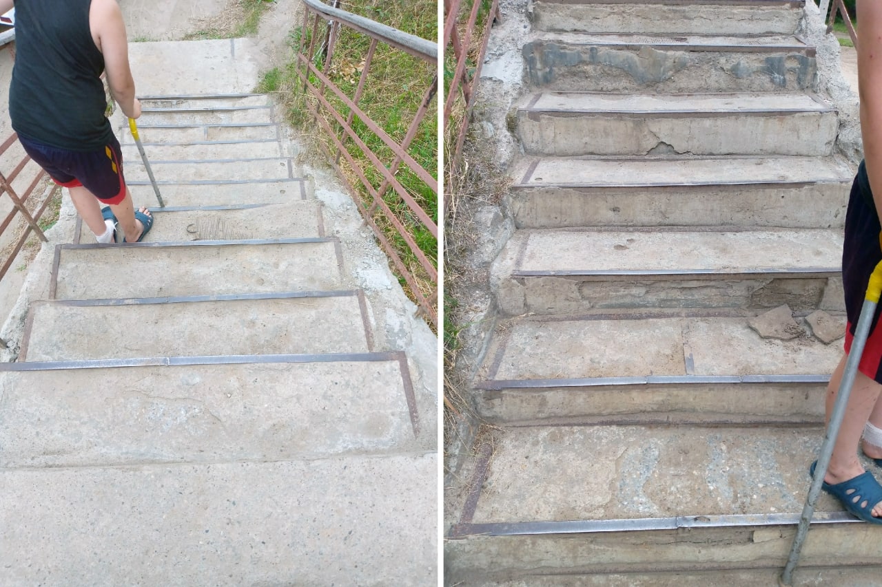 Всё разрушено - бетон осыпался так, что торчит железная обрамлёвка. На подъездной дороге к зданию, где находится скорая помощь проломился "асфальт". Больному за помощью подыматься очень трудно, скорее инвалидом можно стать, если споткнешься. При мне только что бедные работники скорой помощи еле-еле подняли женщину на инвалидной коляске.
