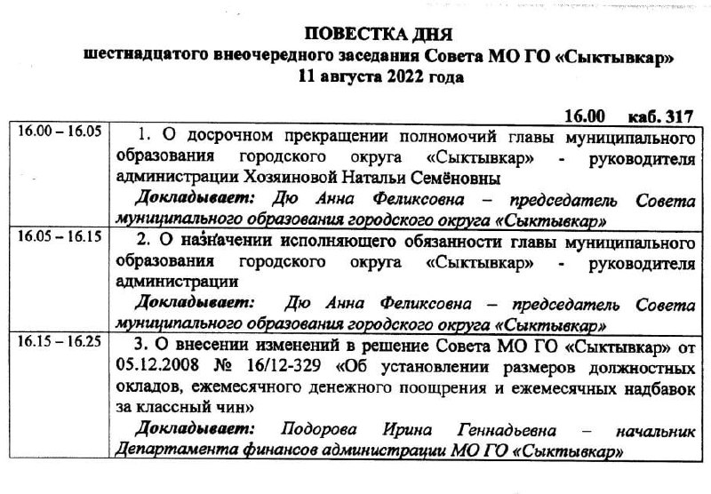 Сегодня в 16:00 поставили внеочередную сессию Совета Сыктывкара с вопросом о сложении полномочий Натальи Хозяиновой и назначения и.о. Владимира Голдина. Предупредили депутатов час назад, хотя предварительно обговаривались числа 12 и 15 августа.