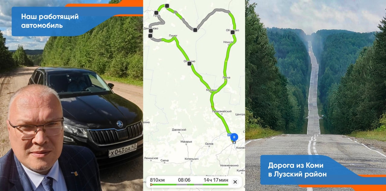 Часть пути по Коми Александр Соколов преодолел по трассе Вятка, там асфальт на 95% в идеальном состоянии, а вот поворот на Лузу оставляет желать лучшего, Уйба туда не ездит, поэтому ремонтировать не будет. Но с другой стороны, если губернатор Кировской области придёт с этим вопросом к нашему, то может быть совместно приведут этот путь к совершенству. Соколову надо, у него выборы 11 сентября, баннеры по всей области висят, а вот нашему далеко до переизбрания.