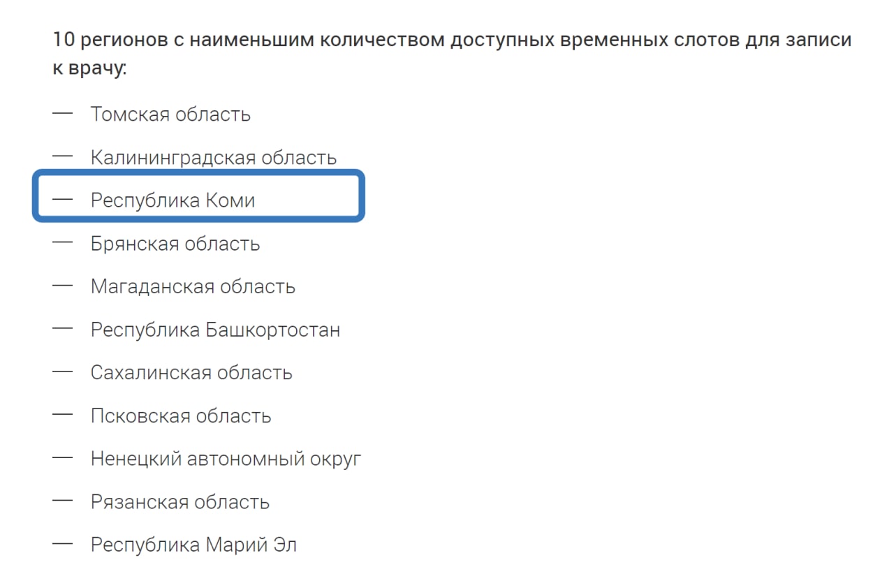 Самый востребованный сервис на Госуслугах — «Запись на прием к врачу». Минцифры совместно с Минздравом проверили качество оказания услуги «Запись на прием к врачу» и составили рейтинг регионов, исходя из показателей технических и организационных ошибок при записи за второй квартал 2022 года. Республика Коми попала в ТОП-10 регионов с наименьшим количеством доступных временных слотов для записи к врачу. Одна из причин, чтобы более пристально посмотреть Минздраву на наш регион.