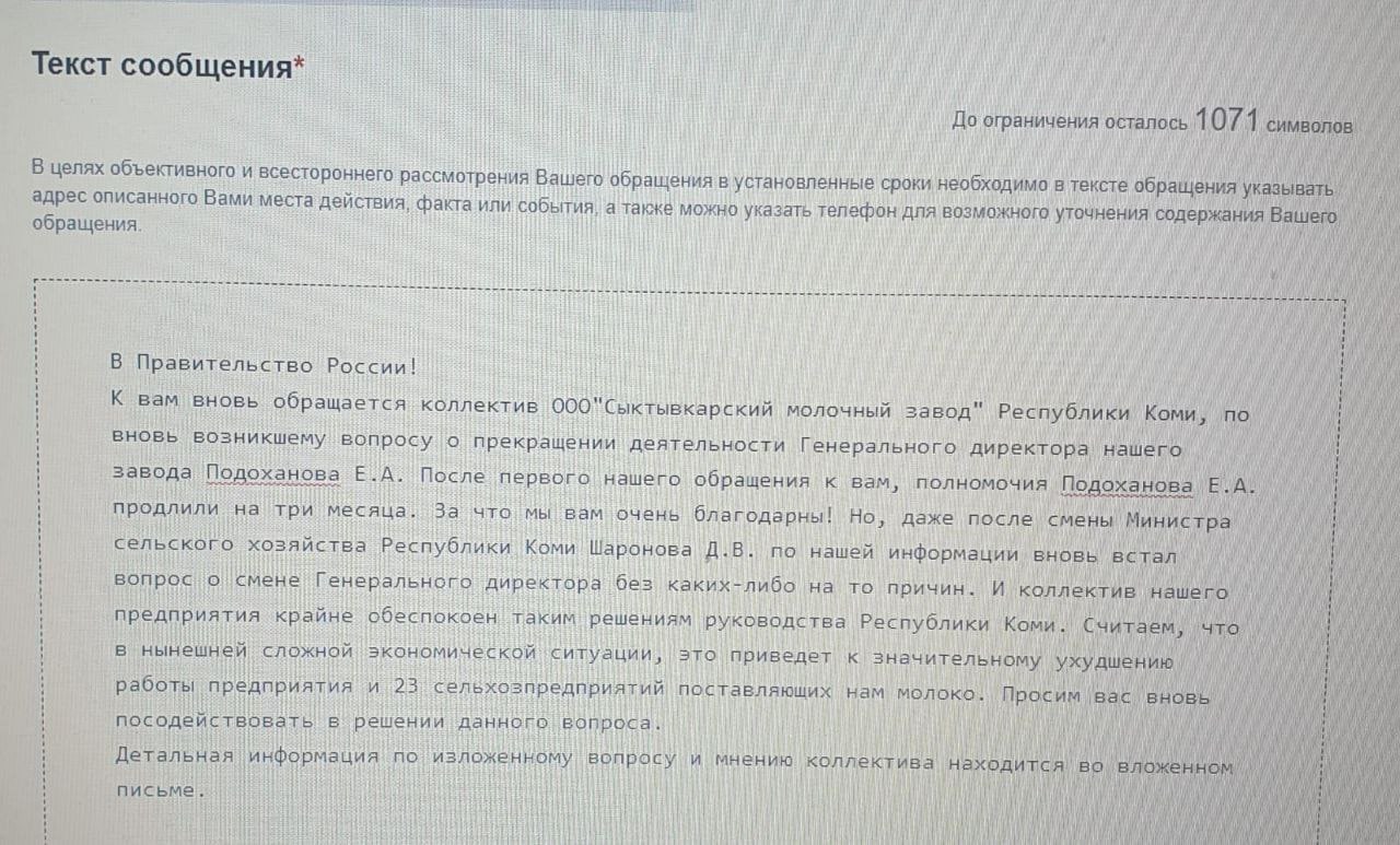 Коллектив ООО «Сыктывкарский молочный завод» написал обращение президенту страны с просьбой помочь. Они не хотят терять хорошего управленца - директора молокозавода.