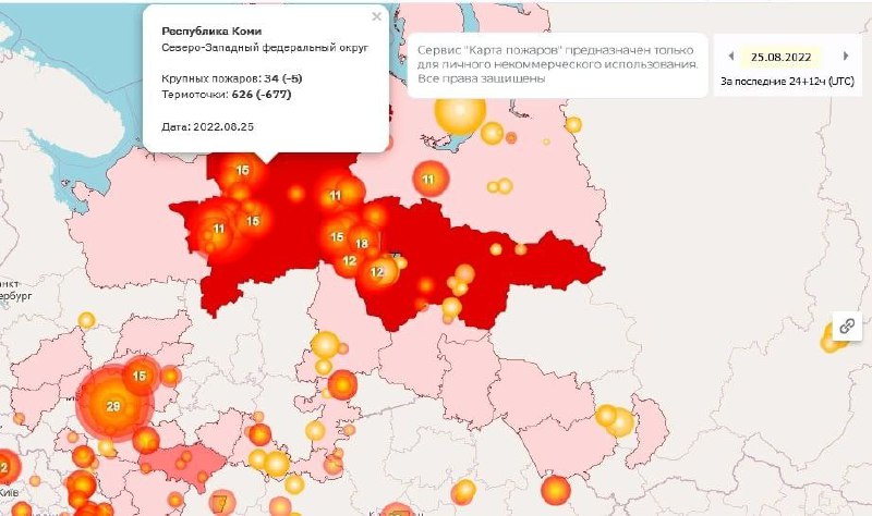 На данный момент в Коми действуют 43 лесных пожара на общей площади 15,862 тыс. гектаров. Больше всего возгораний зафиксировано в Княжпогостском, Удорском и Усть-Цилемском районах. Некоторые очаги достигают площади 5 тыс. гектаров.