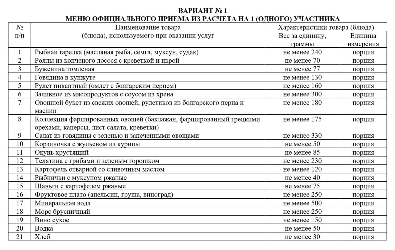 Вероятно, по протоколу, когда приезжает официальная делегация её надо кормить и кормить хорошо. Посчитайте сколько вы тратите денег на себя в сутки, если разделить ваш субботний поход в магазин на семь дней... посчитали? И всё равно выйдет меньше. По условиям аукциона на каждого участника делегации заложили 5 123 рубля. Помимо еды в меню входит либо водка, либо и водка и вино.