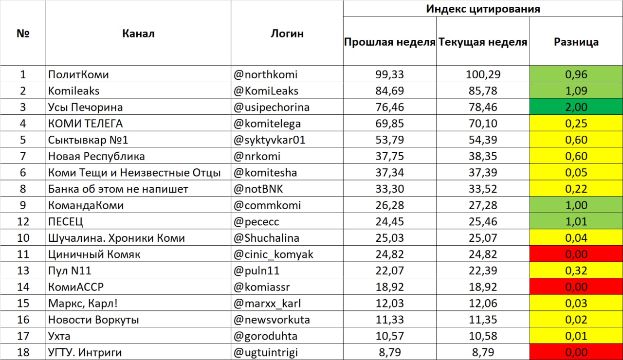 Выходной день на календаре, а это значит, что пора знакомить читателей с рейтингом цитирования каналов местной коми поляны. По многочисленным просьбам мы убрали каналы, которые давно не пишут и почти умерли.