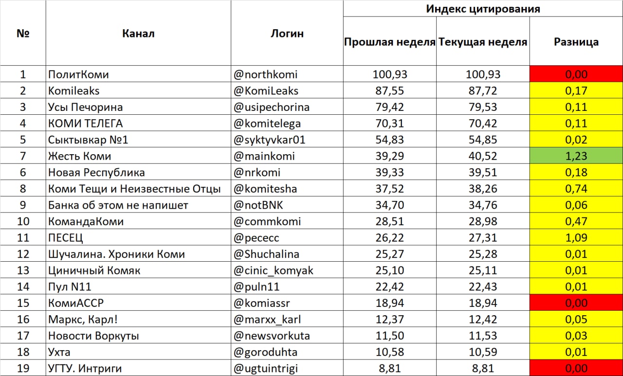 Выходной день на календаре, а это значит, что пора знакомить читателей с рейтингом цитирования каналов местной коми поляны. По многочисленным просьбам мы убрали каналы, которые давно не пишут и почти умерли.