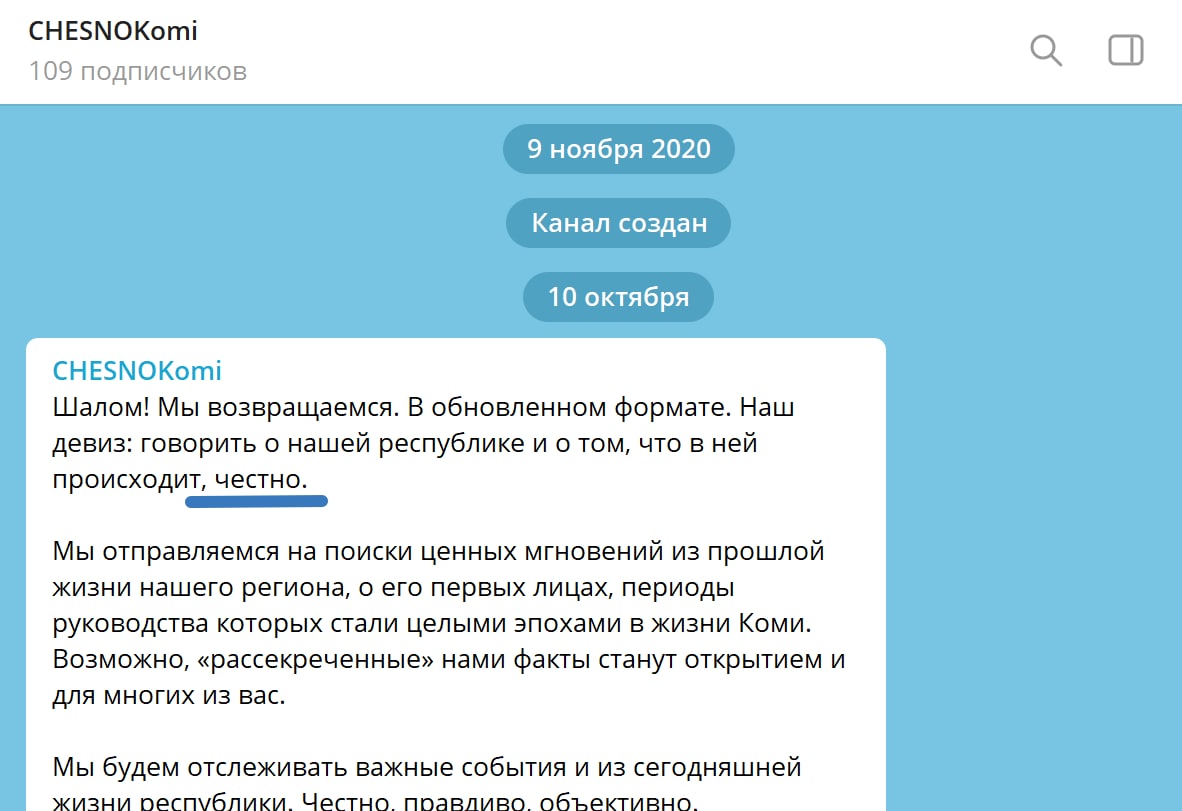 Мы наблюдаем интересный момент, Владимир Уйба нашёл деньги на свою пиар кампанию. Он понял, что региональным СМИ доверия мало, так как все знают, что БНК и Комиинформ сидят на шее государства и питаются из регионального бюджета отчасти. Поэтому пошли вливания в telegram-каналы, вот на днях разбудили старый канал CHESNOKomi. По нашей информации, его опять же админит Даша Шучалина. Его создавали два года назад, но сейчас удалили все старые сообщения и принялись писать новую правду для 109 подписчиков.