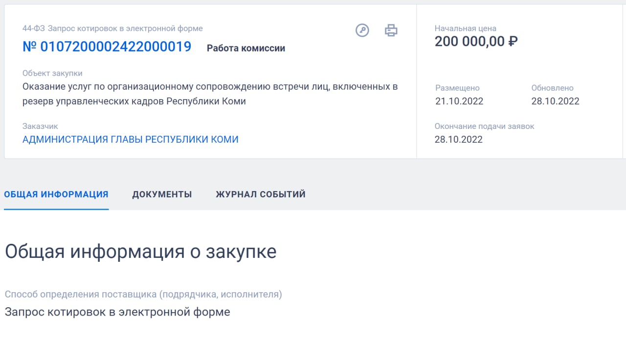 Администрация Главы Республики Коми готова потратить 200 000 рублей на оказание услуг по организационному сопровождению встречи лиц, включенных в резерв управленческих кадров Республики Коми.