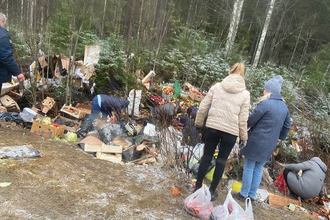 Сегодня к месту стихийной свалки с едой одни за другими приезжали люди, чтобы набрать бесплатных овощей и фруктов.