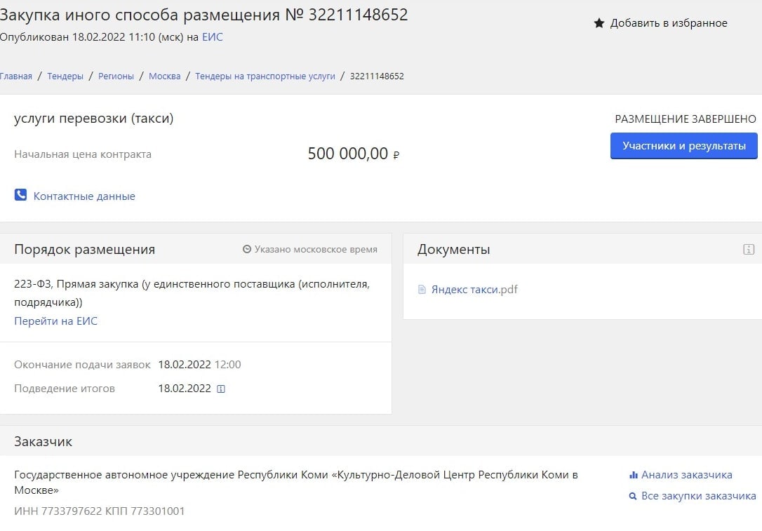 Ну, реально. Для чего жители Севера их там кормят? А вот мы знаем, ну не прям точно, но догадываемся. Их там держат для того, чтоб ездить на работу на такси! Вот тендер, объявленный ГУ-шкой Представительства в Москве. Контракт без торгов с Яндекс-такси на 500 тыс рублей.