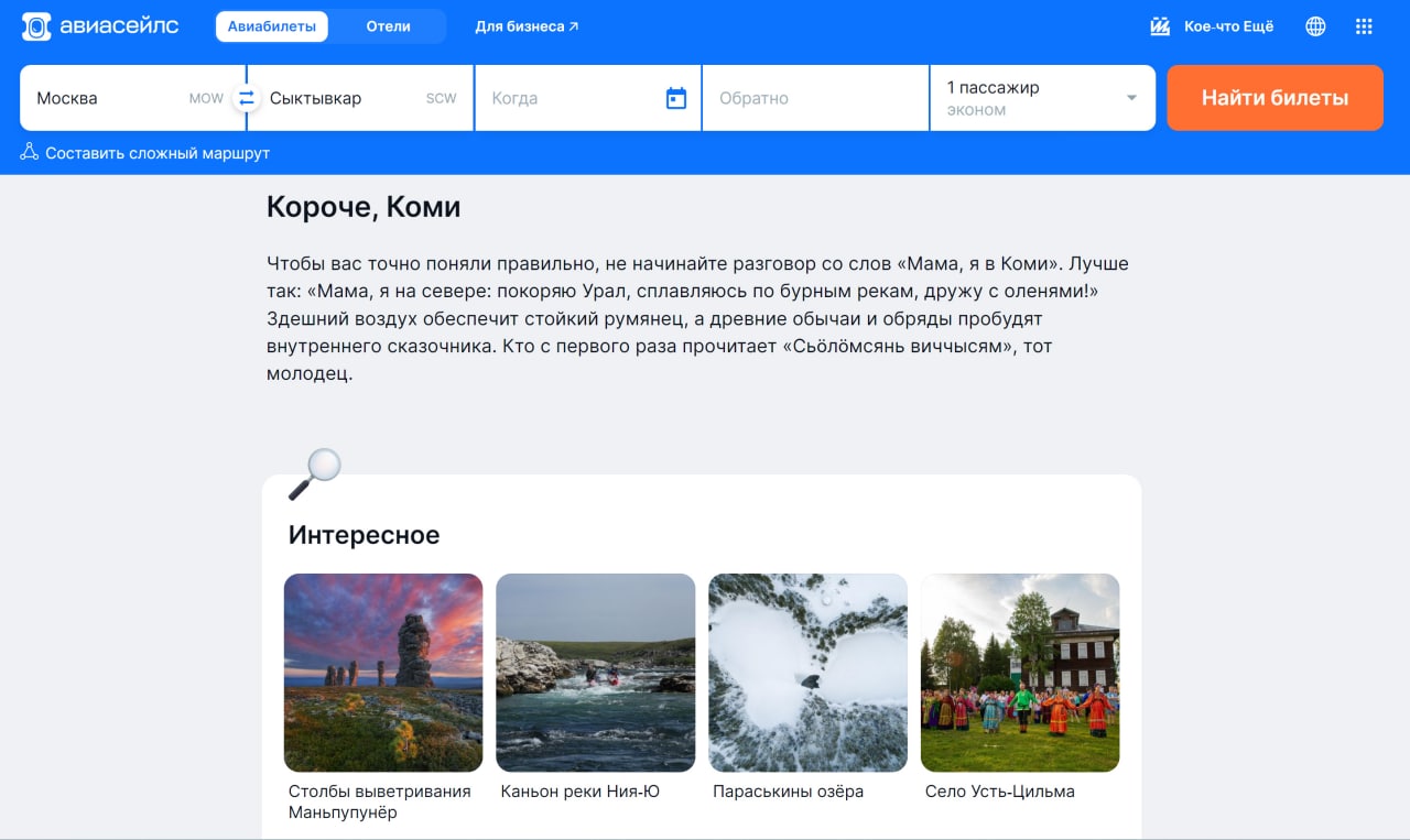 Агентство по туризму Коми быстро засуетилось, чтобы показать свою значимость после реорганизации Ростуризма. Агентством было организовано партнёрство с крупнейшей площадкой для путешествий по России — Aviasales. Теперь информация о том, что посмотреть в Коми, где остановиться и другие полезные советы указаны на сайте и в приложении проекта. Скоро появятся и лучшие места общепита региона.
