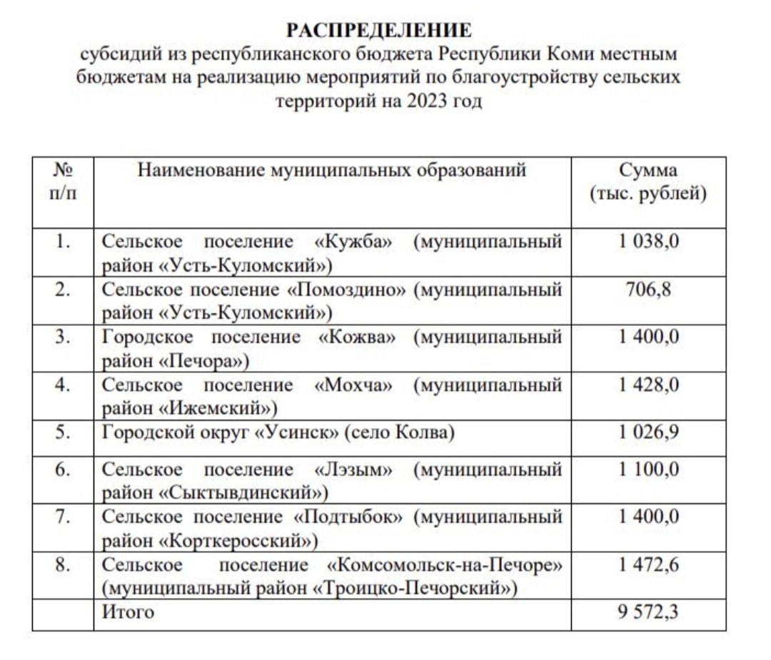 Заместитель председателя правительства Республики Коми – министр финансов региона Владимир Казаков подписал постановление о распределении субсидий из республиканского бюджета на реализацию мероприятий по благоустройству сельских территорий на 2023 год.