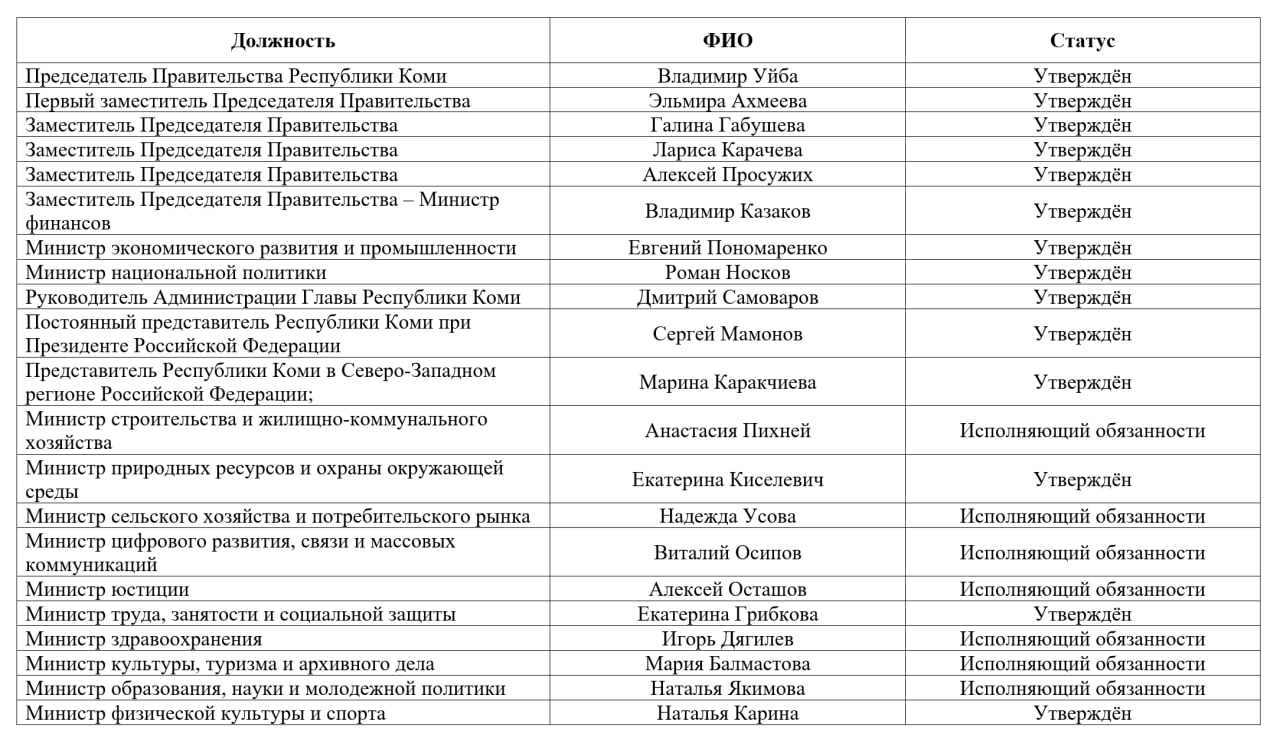 А что мешает убрать эти нелепые непонятные приставки у Марии Балмастовой, Натальи Якимовой и Алексея Осташова? Они трудятся в своих министерствах продолжительное время, отвечают требованиям руководителей и полностью соответствуют своей должности. Кажется, это некое недоверие со стороны председателя Правительства Коми. Ещё раз, статус «исполняющий обязанности» носит временный характер и подразумевает, что на эту должность назначается лицо, которое впоследствии заменят на постоянного министра. Если Балмастову, Якимову и Осташова не планируют менять, тогда зачем им эта приставка? Владимир Уйба придумал критерий перевода лишь для Минкульта, он установил планку в 200 000 туристов в год, но по отчётам министерства Республику Коми посетило уже порядка 400 000 человек. Значит пора переводить Марию Алексеевну в министры. Для Осташова и Якимовой такие критерии не озвучивались.