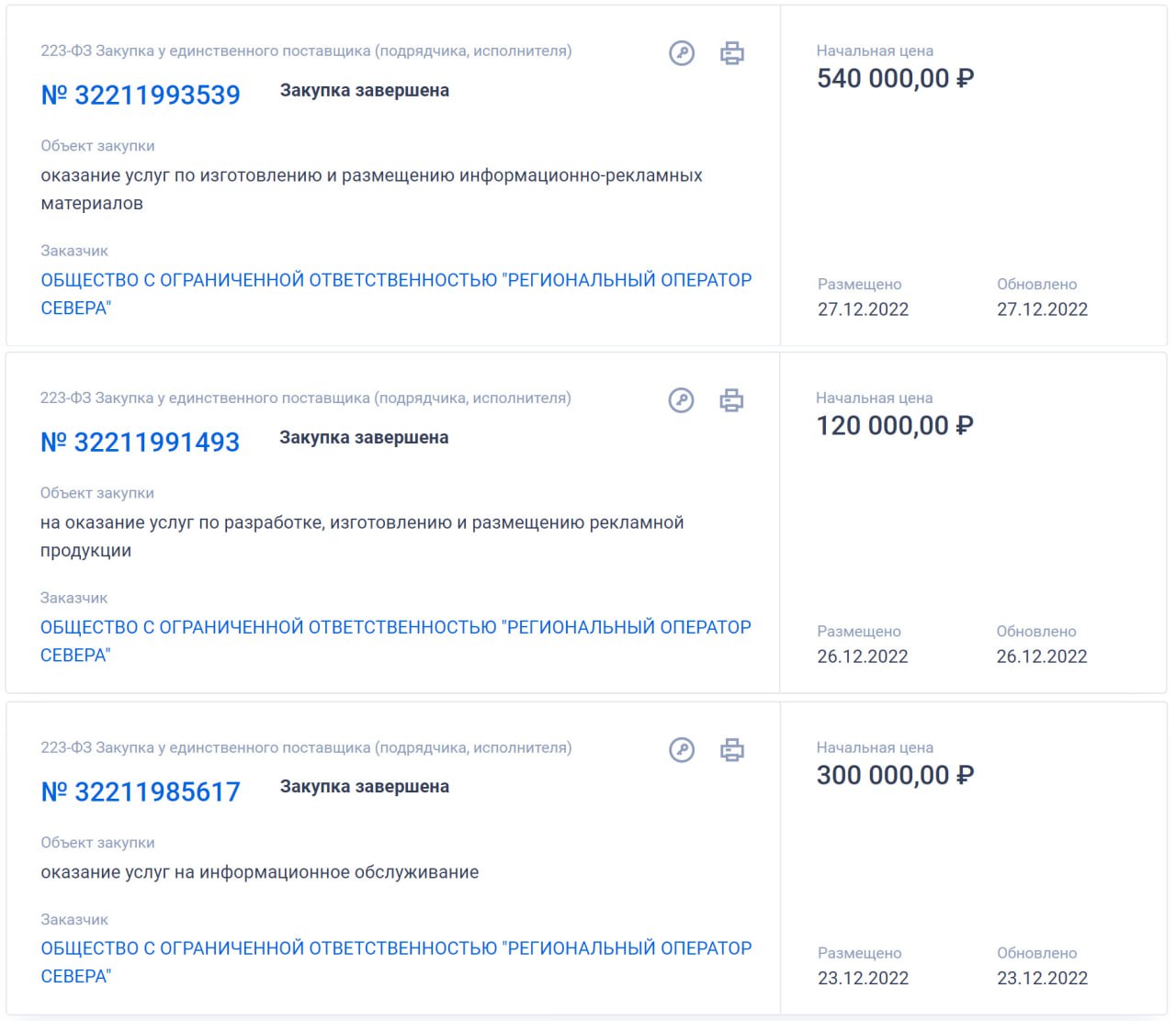 Монополист на рынке услуг по вывозу твёрдых коммунальных отходов в Коми считает, что он недостаточно известен и популярен в информационном поле. В конце прошлого года Регоператор разместил несколько аукционов (отыскали только четыре) на «услуги по изготовлению и размещению информационно-рекламных материалов». Что интересно все позиции были направлены на закупку у одного поставщика, у известных региональных информационных медиа.