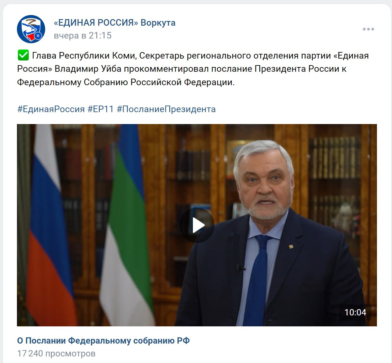 Разница между Владимиром Уйбой и другими политиками видна невооружённым взглядом. Простой пример, вчера президент огласил послание Федеральному Собранию, все руководители обязаны выпустить комментарий и опубликовать в официальных группах/каналах/аккаунтах.