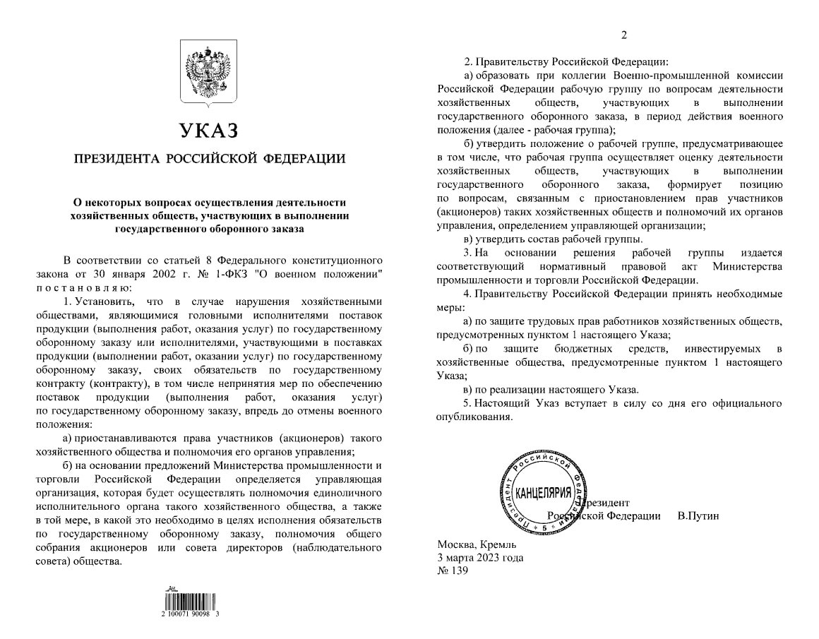 В российских компаниях, которые срывают сроки по гособоронзаказу, в случае объявленного военного положения будет вводиться внешнее управление, следует из указа президента Владимира Путина. Права акционеров таких компаний будут приостанавливаться.