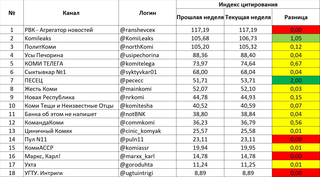 Выходной день вчера был на календаре, а это значит, что пора знакомить читателей с рейтингом цитирования каналов местной коми поляны по итогам прошедшей недели. В понедельник уже все показатели пришли в норму, поэтому сегодня более точная статистика.
