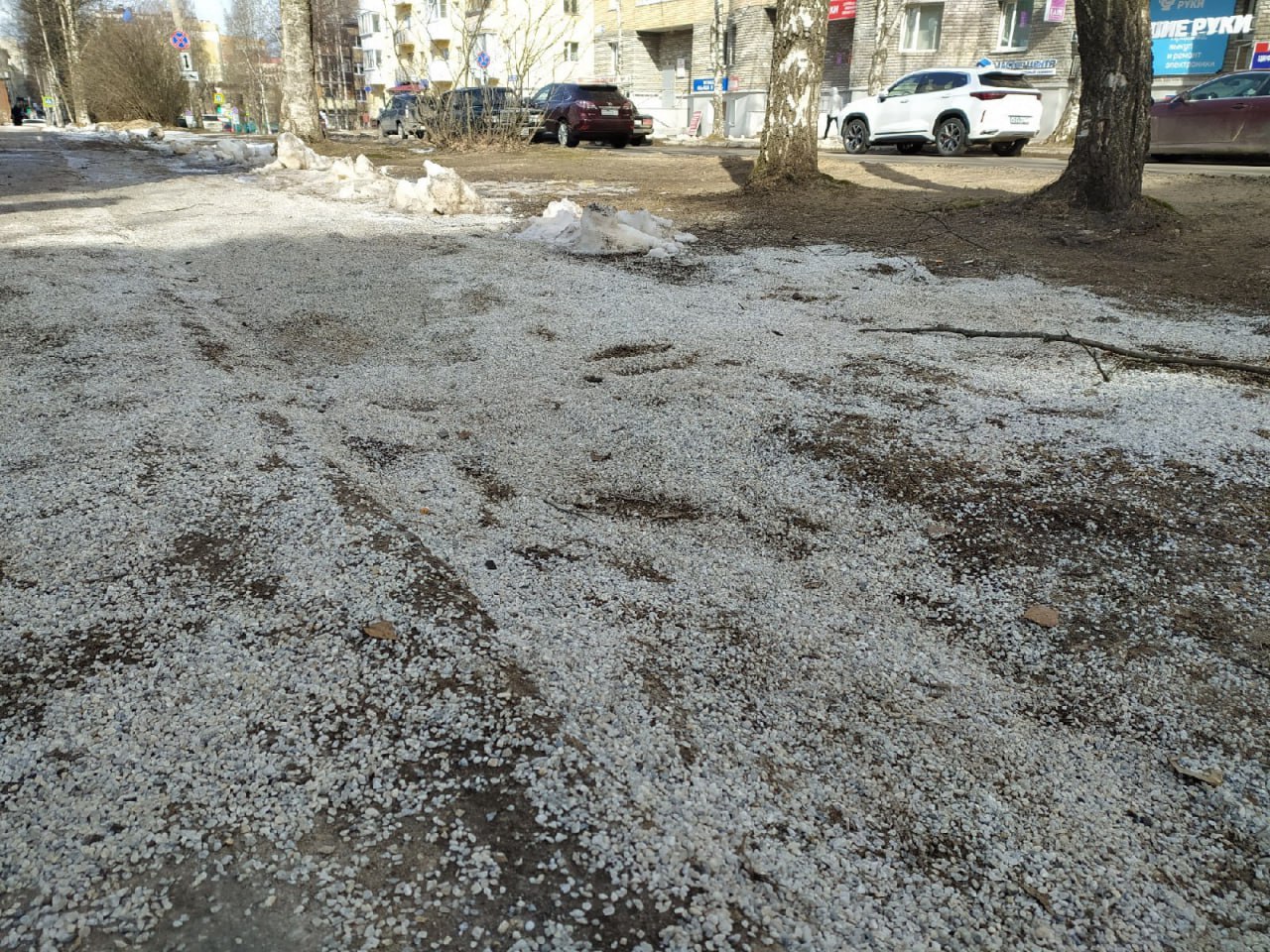 На улицах Сыктывкара можно встретить тротуары полностью засыпанные мраморной крошкой. Так дорожные службы борются с гололёдом, вместо песка с солью посыпают крошкой. Снег и лёд растаяли, а крошка осталась, но её обещали вскоре убрать.