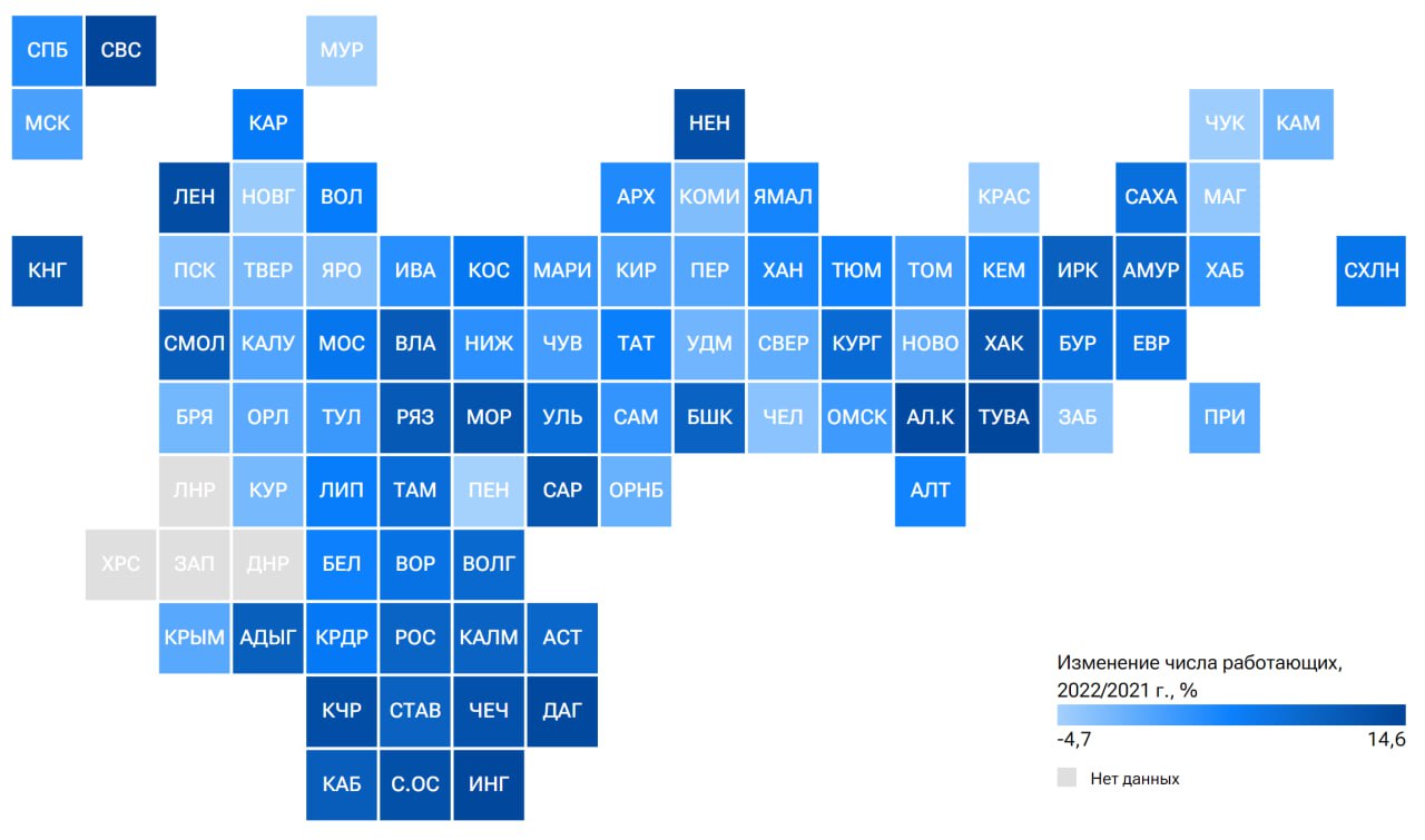 А теперь сопоставим показатели регионов Северо-Запада, ведь всё познаётся в сравнении. Укажем место в общем рейтинге, процентную разницу 2022/2021 и абсолютное значение в количестве рабочей силы.