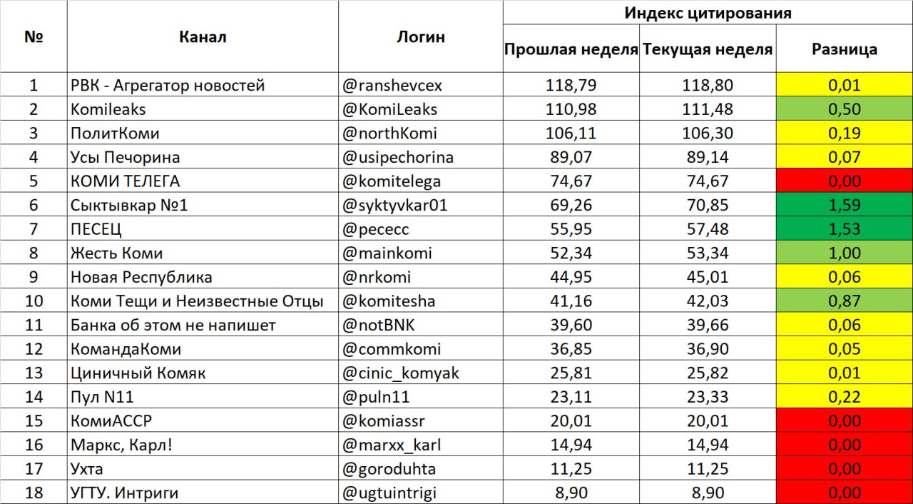 Выходной день вчера был на календаре, а это значит, что пора знакомить читателей с рейтингом цитирования каналов местной коми поляны по итогам прошедшей недели. В понедельник уже все показатели пришли в норму, поэтому сегодня более точная статистика.