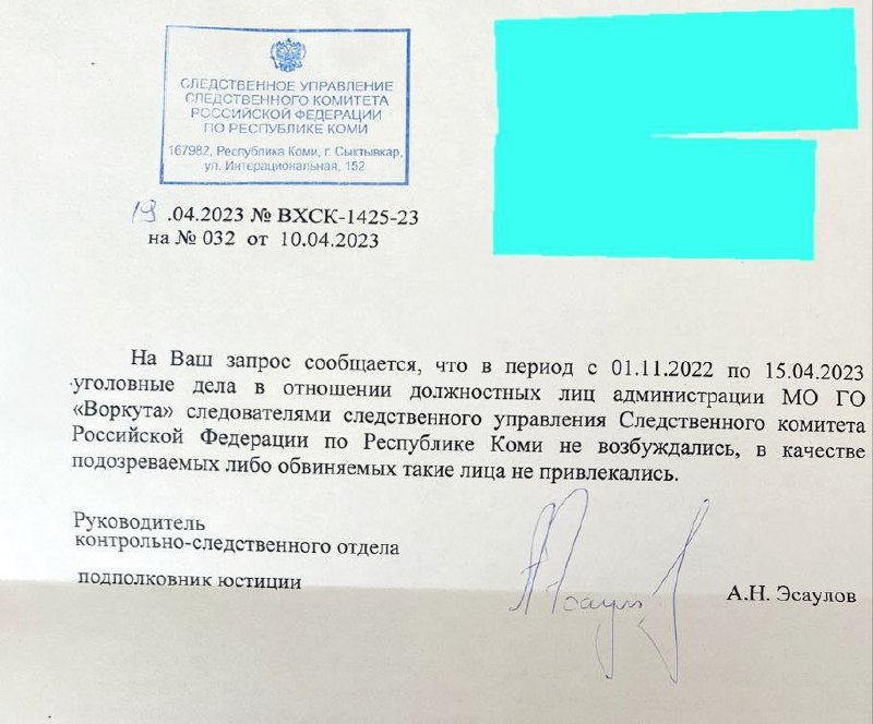«Уголовные дела в отношении должностных лиц администрации МО ГО «Воркута» следователями следственного управления СК РФ по РК не возбуждались, в качестве подозреваемых, либо обвиняемых такие лица не привлекались».