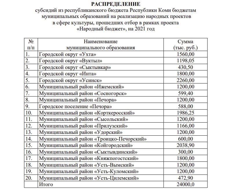 На эти цели из регионального бюджета выделено 24 миллиона рублей. Субсидию получат все муниципалитеты. Наибольшая сумма уйдет в Усинск – это 2,2 млн рублей. Также значительная дотация будет начислена Койгородскому району – 2,03 млн. рублей. Наименьшие средства на народные проекты в сфере культуры выделили Сыктывдинскому району - 300 тыс рублей.