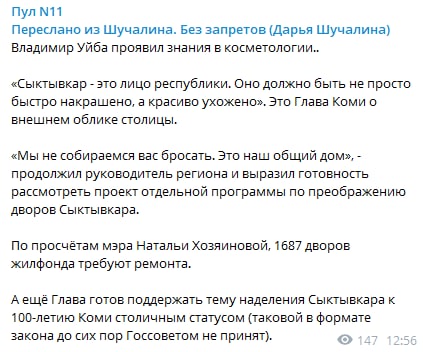 Даша Шучалина уже не палится, пропихивает в канал Администрации Главы Коми свои посты. Не понятен замысле автора, то ли она хочет продвинуться за счёт большего числа подписчиков ПУЛа, то ли она просто перестала скрывать лицо администратора канала Главы.