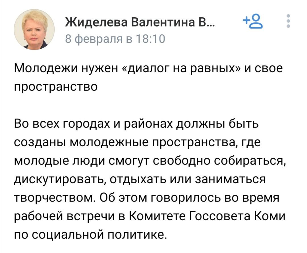 Региональные депутаты, в частности Валентина Жиделева, как и федеральные парламентарии, высказываются за создание единых дискуссионных молодежных площадок.
