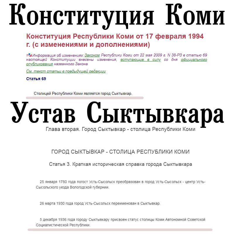 Мы же дотошные, полезли читать документы. Есть в Коми Конституция, в ней в 69 статье есть слова про то, что Сыктывкар столица Коми. У города Сыктывкара есть свой Устав, так и там в третьей статье прописано, что 5 декабря 1936 года ему присвоено звание столицы Коми. Тогда что хочет сделать Уйба? Есть мнение на этот счёт? Готовы его выслушать и, если хотите, можем опубликовать в нашем канале. Пишите сюда @Komileaks11, мы ждём ваших ответов.