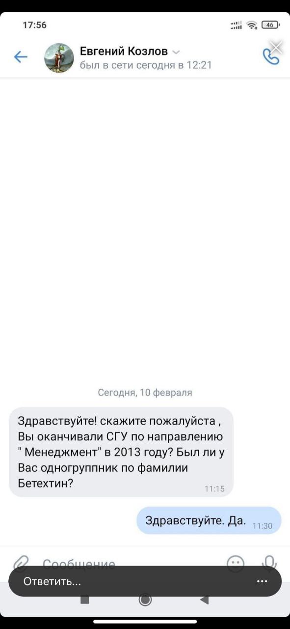 Сегодня однокурсникам Бетехтина разослали вот такие сообщения. Удалось ли им что-то выяснить, пока непонятно. Но судя по всему это разозлило самого Бетехтина, он даже порекомендовал новоиспеченным шерлокам сходить "на факультет и в общагу на Димитрова 56/1".