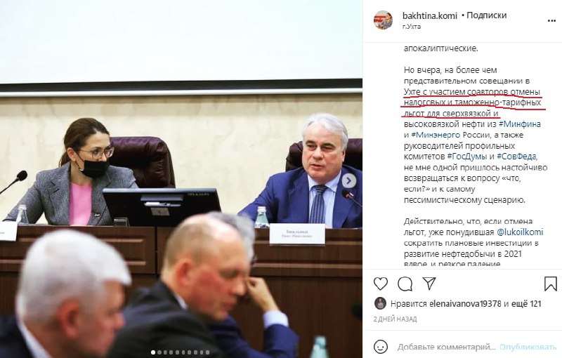 Даже в этом вроде бы безобидном посте в сети Инстаграм о рабочем совещании в Ухте (по вопросу сохранения преференций для нефтянки) сквозит недовольство, и даже какое-то чувство превосходства, как она сама пишет, над «соавторами отмены льгот» - Минфином, Минэнерго, федеральными депутатами. Хвалить федералов не за что, они свое "черное" дело сделали еще полгода назад! Но все же чиновники приехали в холодную Коми с открытым забралом, с желанием подправить ситуацию. Подобные неэтичные моменты руководства региона уже стоили отношений с «Монди СЛПК», с «Северсталью». Научиться быть партнерами по-настоящему пока у команды варягов в Коми не получается!