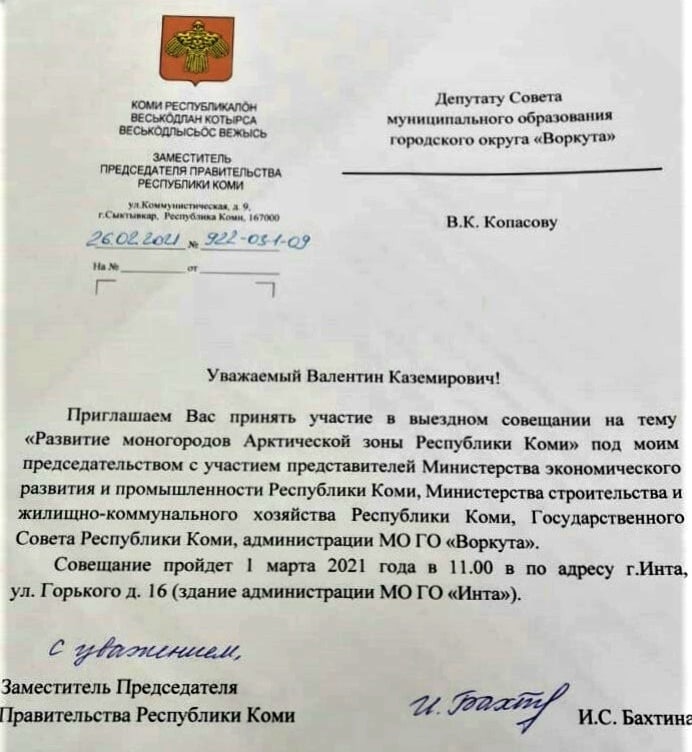 Депутат Воркуты Валентин Копасов получает письмо-приглашение от Ирины Сергеевны Бахтиной, а благодарит за то, что его позвали какую-то Елену Сергеевну. И что самое смешное, не стыдится выкладывать это у себя на странице в ВК.