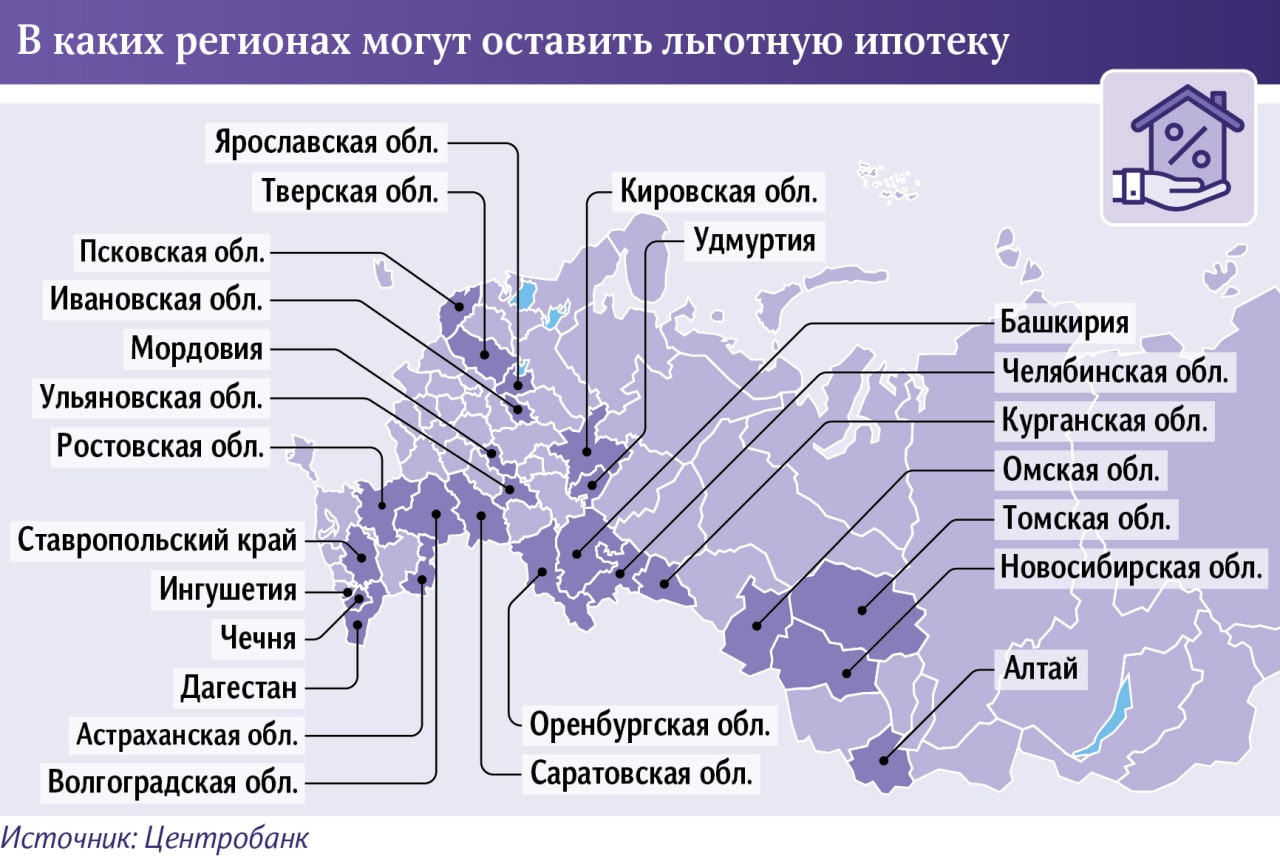 По расчетам регулятора, есть 24 субъекта, в которых можно было бы продлить программы льготной ипотеки без негативных эффектов. Это Башкортостан, Удмуртия, Мордовия, Алтай, Дагестан, Чечня, Ингушетия, Ставропольский край, Новосибирская, Ростовская, Челябинская, Ярославская, Саратовская, Волгоградская, Тверская, Ульяновская, Кировская, Ивановская, Оренбургская, Омская, Псковская, Астраханская, Томская, Курганская области.