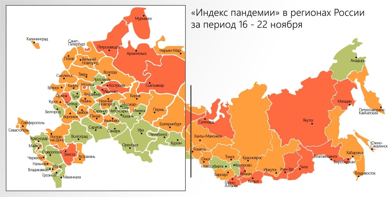 Республика Коми по-прежнему находится в «красной зоне» из-за наихудшего индекса пандемии, сочетающего показатели числа новых заболевших, активных кейсов и умерших в расчете на душу населения. По сравнению с прошлой неделей ситуация кардинально не изменилась.