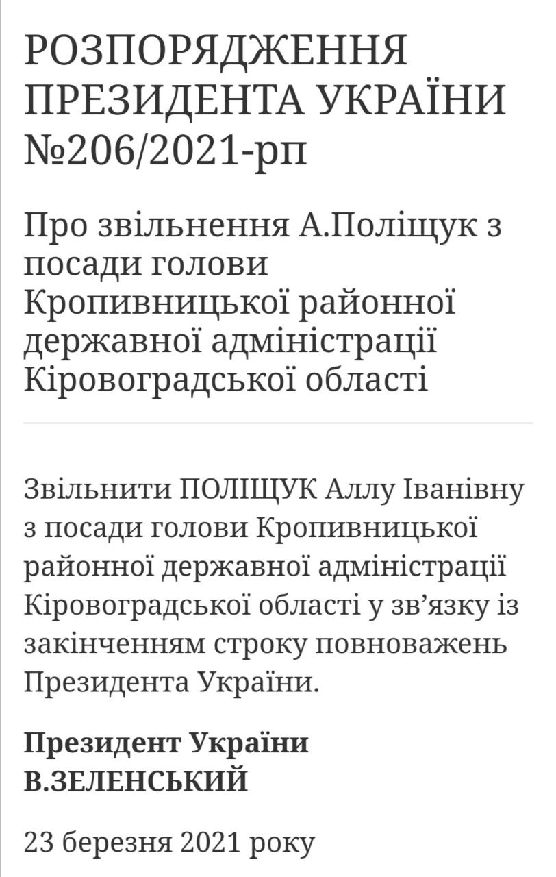 На сайте главы государства появилось распоряжение № 206/2021-рп об увольнении Аллы Полищук с поста главы Кропивницкой районной государственной администрации Кировоградской области.