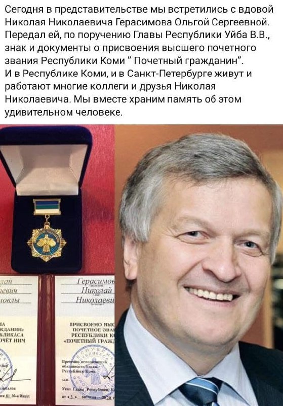 Вдове заместителя Председателя Правительства Герасимова Н.Н. "передали" знак и документы о присвоении знака "Почетный гражданин Республики Коми".