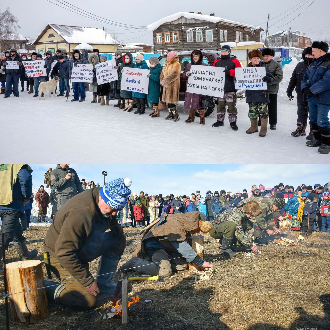 В качестве примера - два фото из Телеграм-канала. На первом - митинг в Ижме 28 февраля 2021 г., организованный депутатом от КПРФ Николаем Братенковым против коммунальных поборов и кадровой политики Главы Республики Коми В. Уйбы. На втором - сам В. Уйба, участвующий в "празднике охотника" в том же Ижемском районе 27 марта 2021 г.