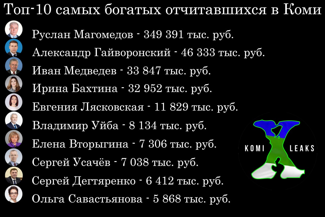Для кого-то это была зарплата от коммерческой деятельности, а для кого-то это заработная плата на посту чиновника и доходы от продажи недвижимости или ценных бумаг. В любом случае и те и те по закону о противодействии коррупции должны были отчитаться о доходах. Согласно требованиям в декларации они вносят только точные суммы и, как правило, не указывают источники доходов. Лишь потом в интервью могут уточнить, где они столько заработали, как это сделали Бахтина, Магомедов и Дегтяренко. Мы взяли федеральных политиков - Госдума, и региональных - Госсовет, Главы муниципалитетов и Правительство. Ещё не все отчитались о своих доходах, например, нет отчётов Воркуты, Удоры, Корткерроса и Сысолы, но не думаем, что они смогут превысить доходы тех, кого мы включили в ТОП-10.