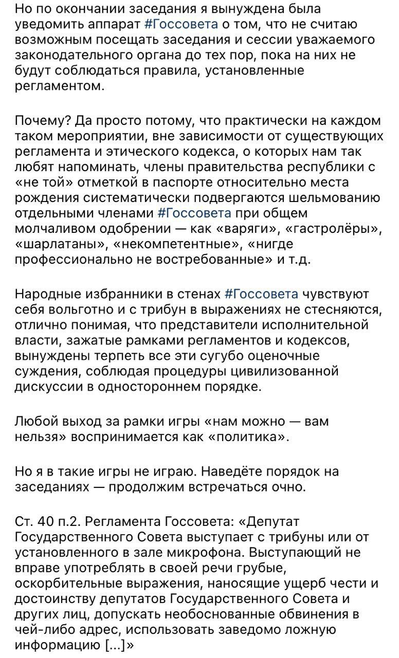Вице-премьер Бахтина И. по итогам скандальной сессии Госсовета Коми через социальные сети заявила, что не готова теперь посещать заседания законодательного собрания региона. Но пикантность ситуации в том, что у чиновника условно два работодателя. Это губернатор и Госсовет Коми (депутаты согласовали нахождение Бахтиной на ее должности) и обижаться на своего же работодателя - это глупо.