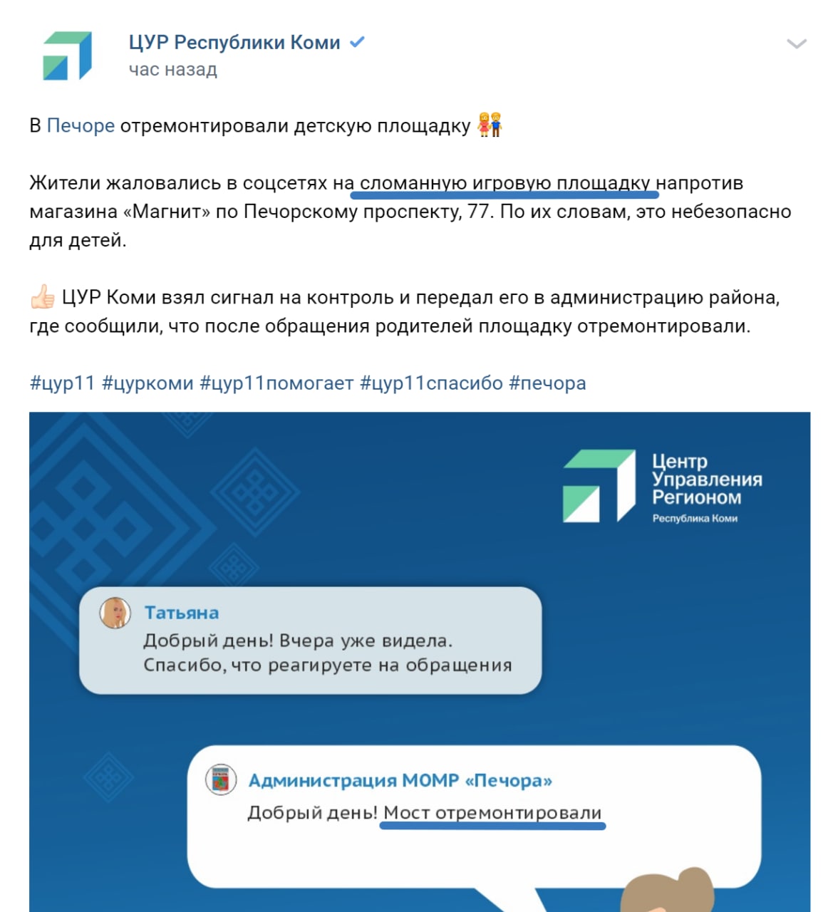 ЦУР11 делает вид, что помогает жителям и постоянно публикует об этом посты в своей группе (группах??). Жители видят, что их сообщения не остаются без присмотра и радуются, что проблему удалось решить. Кто увидел ранее это ещё спорный вопрос, сама власть или этот ЦУР непонятно, но последний забирает всю славу себе.