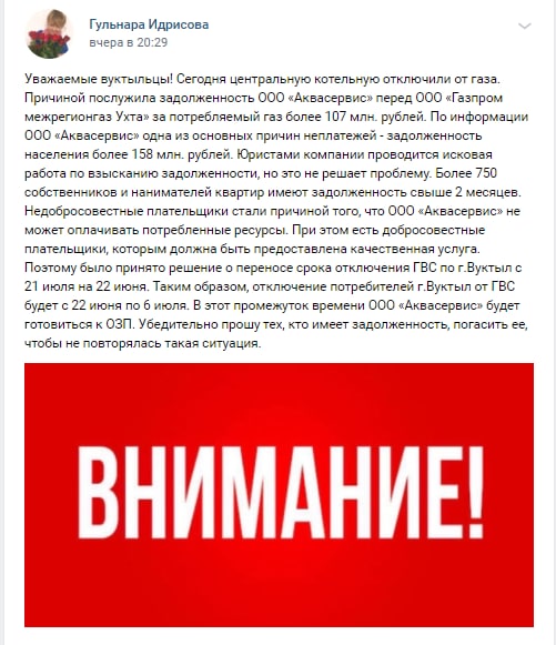 Мэр Вуктыла Республики Коми Гульнара Идрисова "пошла по миру", чтобы выпросить деньги на уплату долгов ООО "Аквасервис" перед «Газпром межрегионгаз Ухта». Видать, этот вариант подсказало Правительство Коми во главе с И. Булатовым. Как это еще можно объяснить?! Напомним, что в Вуктыле с 22 июня отключили горячую воду из-за долгов местной котельной перед газовиками и это в XXI веке!