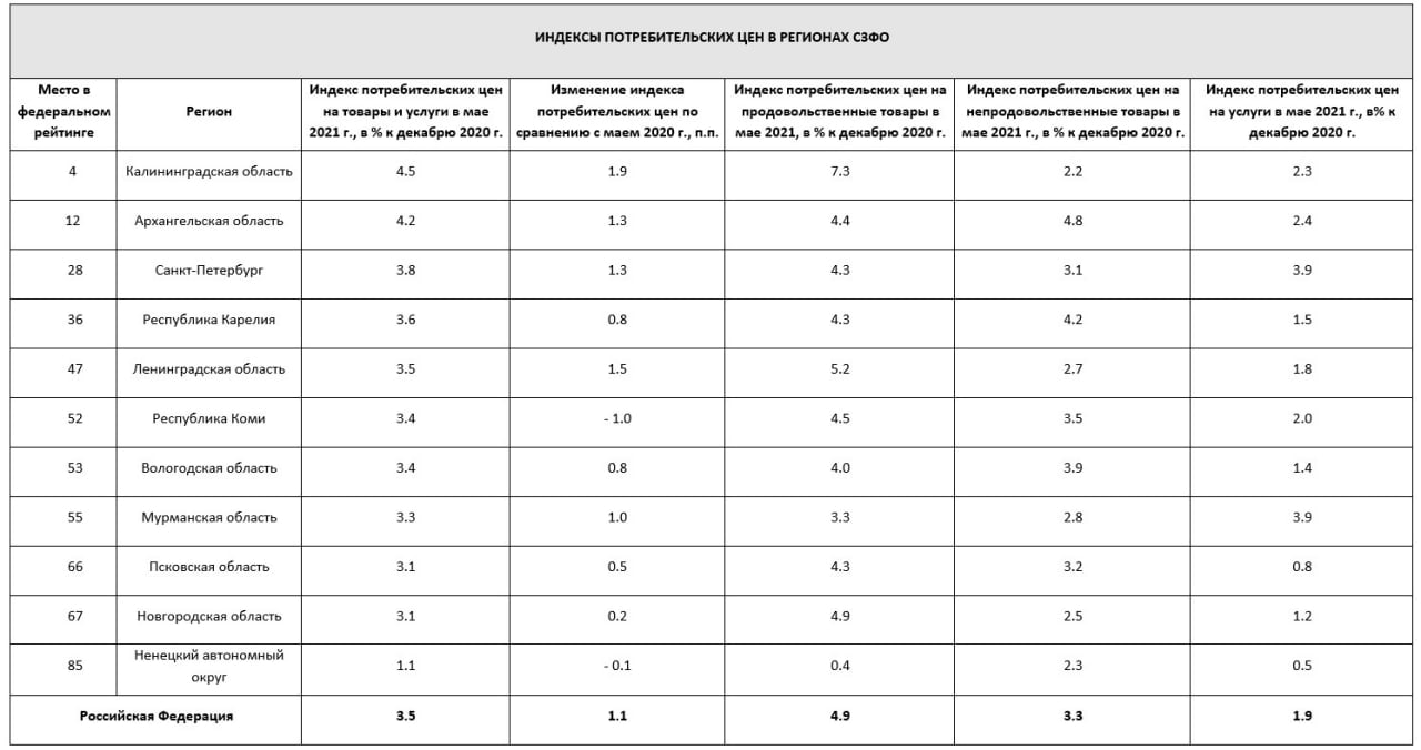 Наибольший вклад в рост потребительских цен вносят продовольственные товары, которые подорожали в январе-мае на 4.9%. Цены на непродовольственные товары выросли на 3.3%, на услуги – на 1.9%. Самый сильный рост цен на продовольственные товары отмечен в Калининградской области (7.3%), меньше всего они выросли в Ненецком автономном округе (0.4%).