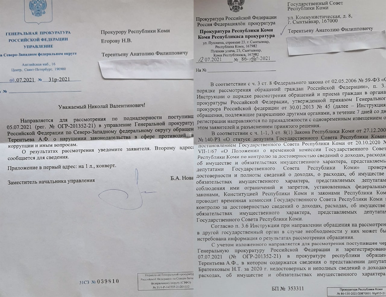 Анатолий Терентьев пишет: У меня есть основание полагать то , что депутат Госсовета Братенков Н.Т. в своей декларации указал недостоверные данные о своих доходах и имуществе. Я написал заявление в Управление Генпрокуратуры по Северо-Западу о недостоверности данных , указанных Братенковым, приложив данные. Кстати я указал на полет семьей Братенковых вертолетом санавиации, не имея медицинских показаний для вызова вертолета. Тем более летал с женой. Вот прикладываю сопроводительные документы из Управления Генпрокуратуры в Прокуратуру Коми, и из Прокуратуры Коми в Госсовет. Братенкова уже выкидывали из райсовета Ижмы за недостоверную декларацию - ему не привыкать.