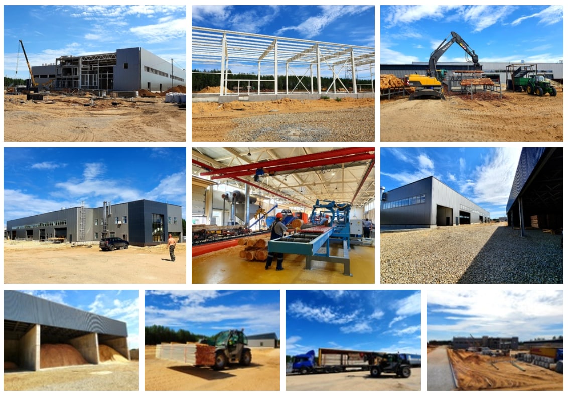Стройка началась в начале 2020 года и работа проделана впечатляющая: вырублена и спланирована территория, сделаны системы водоснабжения и водоотведения, введен в строй первый лесопильный цех, построены крытые склады для пиломатериалов и древесных отходов, построен корпус второго (основного) лесопильного цеха.